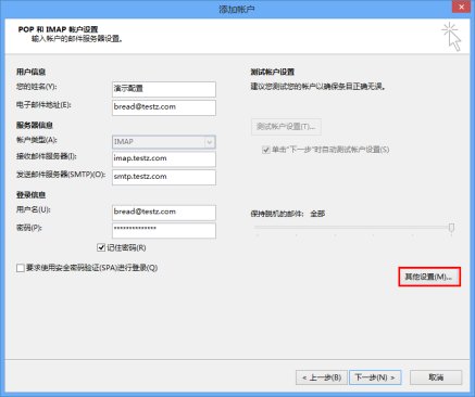 则接收邮件服务器的输入框中输入: imap.testz.com