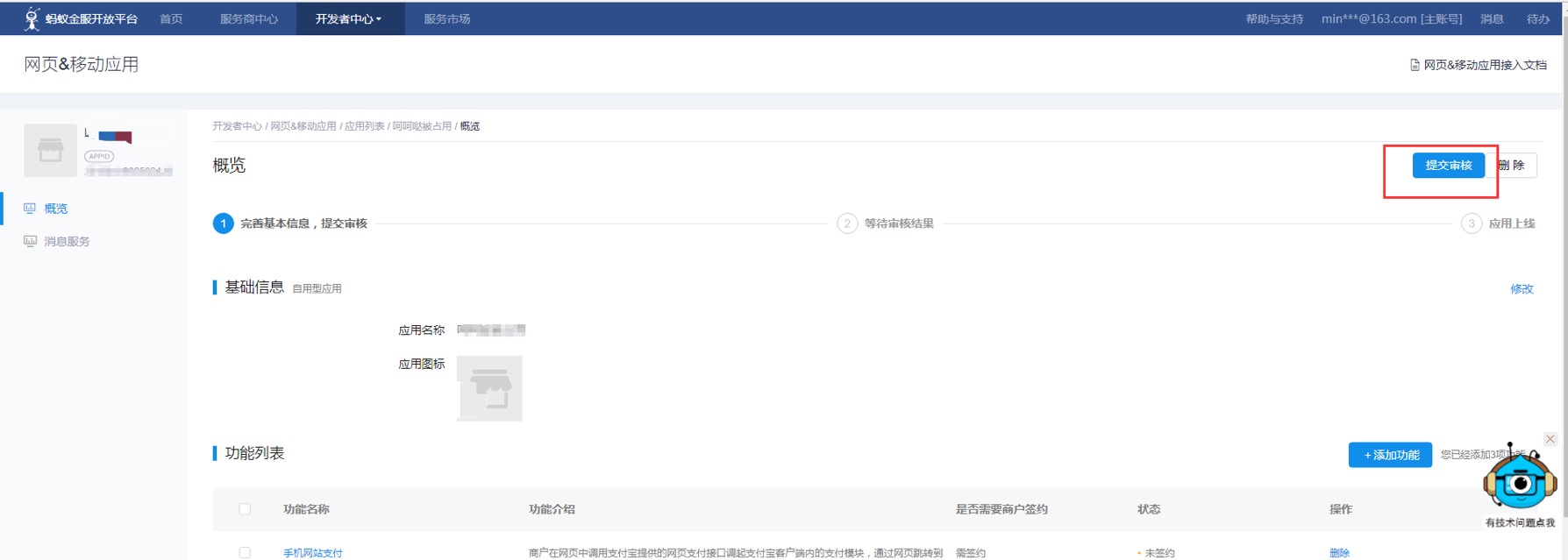 6、提交审核之后,就能获取到开发者应用ID、用户应用私钥和支付宝公钥,