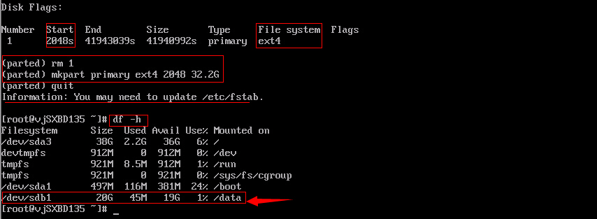 3、创建新分区。这里需要注意的是parted工具里END的值,由于一般大家都不清楚具体的扇区数量,可以使用容量来替代。