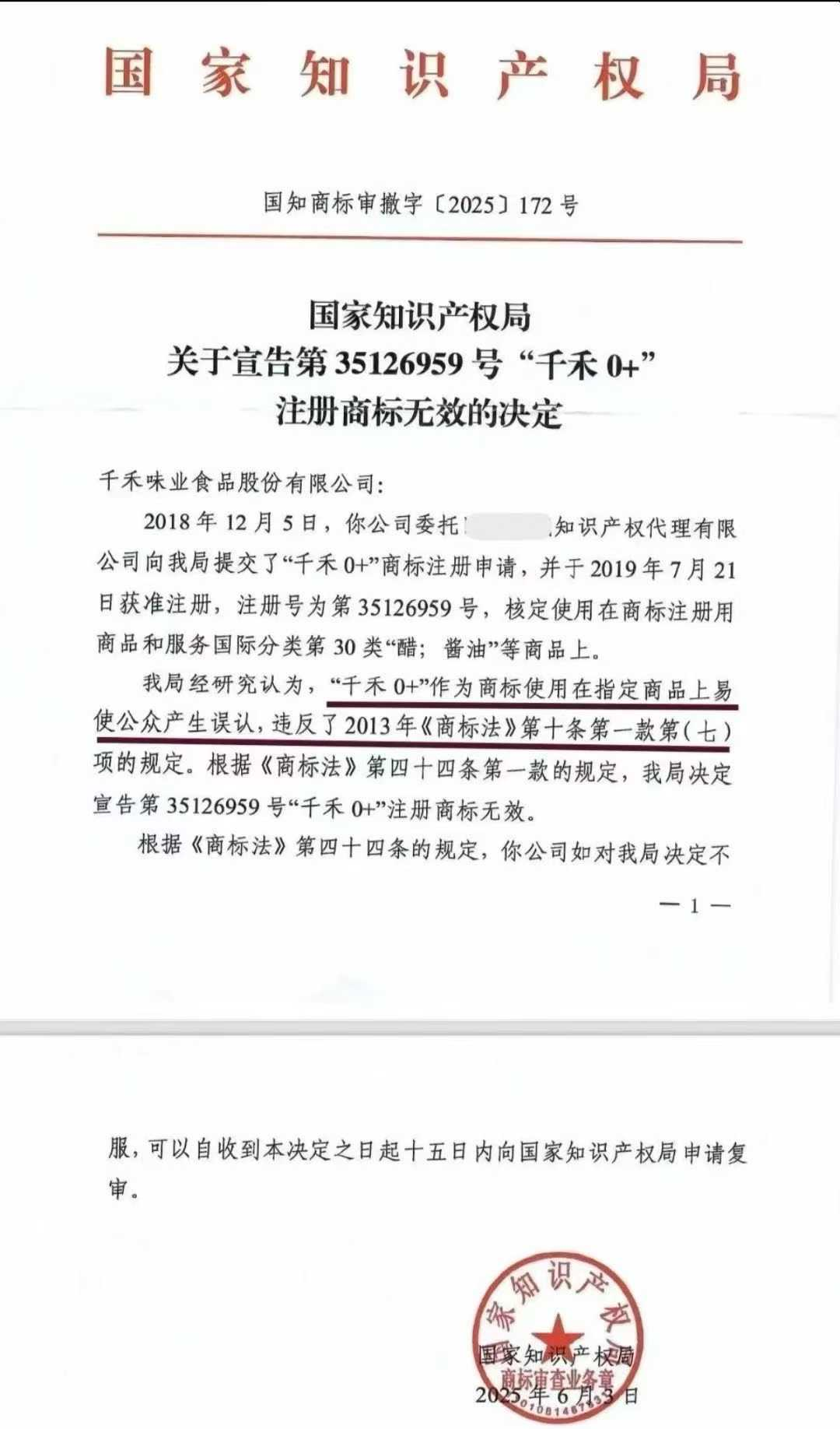 近日,国家知识产权局发布国知商标审撤字〔2025〕172 号文件,正式宣告第 35126959 号 “千禾 0+” 注册商标无效 。这一决定在调味品行业以及广大消费者群体中引起了广泛关注。